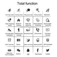 1. Running mode, cycling mode, table tennis mode, tennis mode, skipping mode, badminton, calories, heart rate monitoring, blood pressure monitoring, blood oxygen monitoring, step count, sedentary reminder, motion track, call reminder, message reminder, Alarm reminder, Bluetooth photo, sleep monitoring, APP application, hand-up bright screen, WeChat QQ Facebook, Twitter, etc.