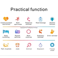 1. 24-hour continuous heart rate monitoring, blood pressure monitoring, blood oxygen monitoring and analysis report, multiple sports modes, hand-on bright screen, caller ID and rejection, information synchronization view, brightness adjustment, sleep monitoring, APP motion track, remote control camera , IP67 waterproof, 0.96 inch large screen display, a variety of dial switch, stopwatch, sedentary reminder, drinking reminder, alarm clock, find mobile phone, do not disturb mode, daily reminder (Facebook, whatsapp, twitter, link, etc.)