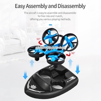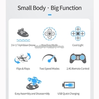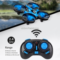 8. Functions: Flight mode: forward and backward, left side flight, right side flight, left rotation, right rotation, 360-degree roll function, front and rear fine-tuning, headless mode, speed switching. Water mode: forward, left turn, right turn. Land Model: Forward, Left and Right Turns
