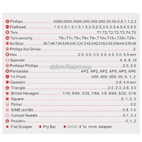 5. Screwdriver bits size: T2 / T3 / T4 / T5 / T6 / T7 / T8 / 1.5 / 2.0 / 2.5 / 3.0 / 1.5 / 2.0 / 2.5 / 3.0 / Y0.8 / Y2.5 / 0.8 / 1.2 / 1.5