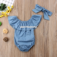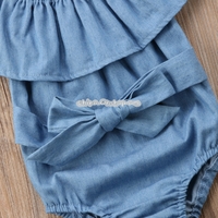 - Female Babies Denim Lotus Leaf Collar Of Shoulder Jumpsuits Triangle Romper + Bow-knot Tie Set
